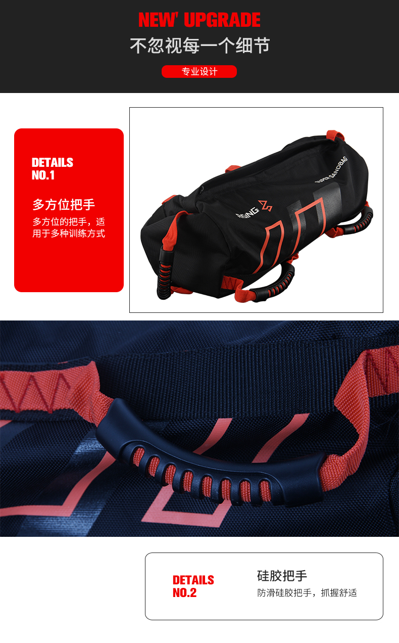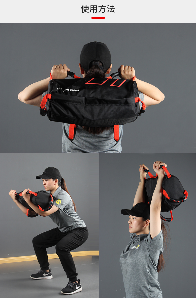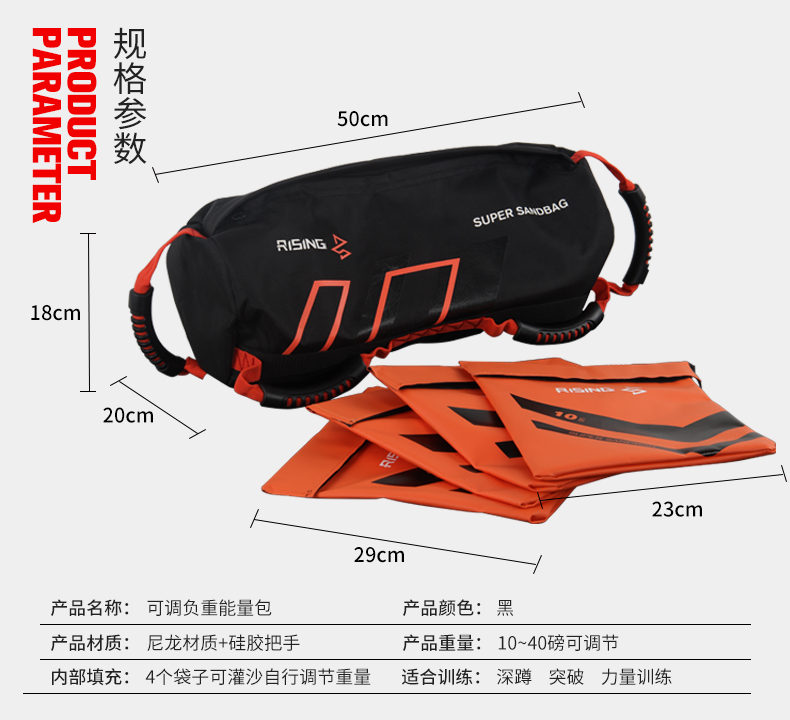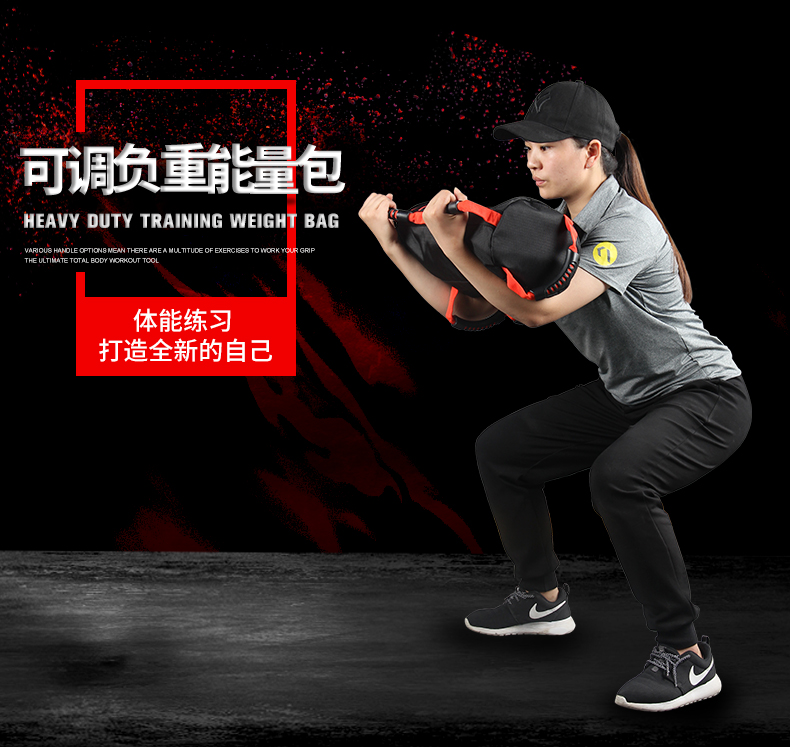 本款能量包为空心材质,需自己选择填充物。包含有填充包,可以自己选择填充多少重量。10~磅可调节(4个袋子可灌沙调节重量)