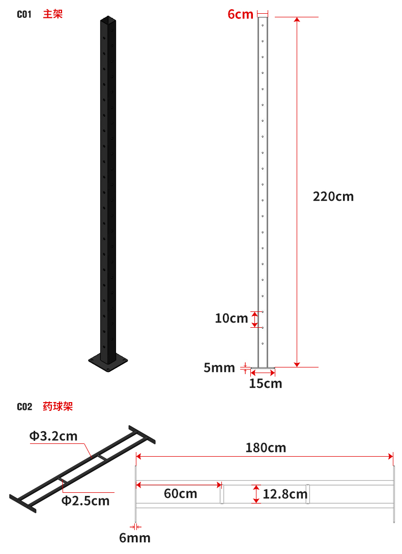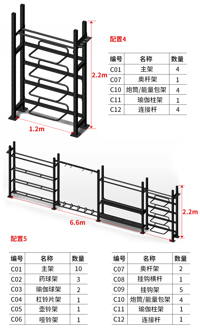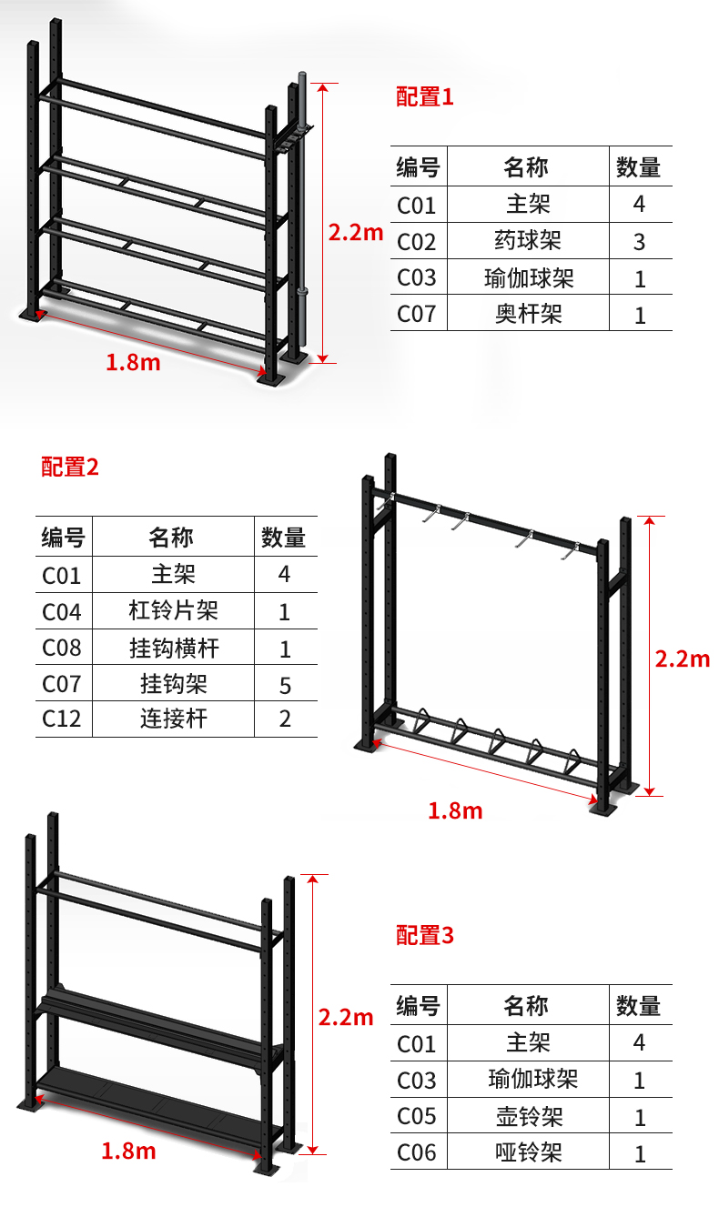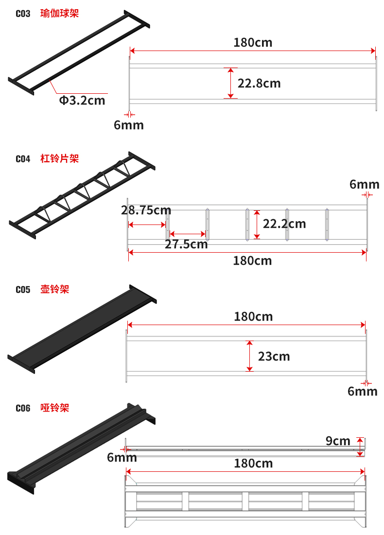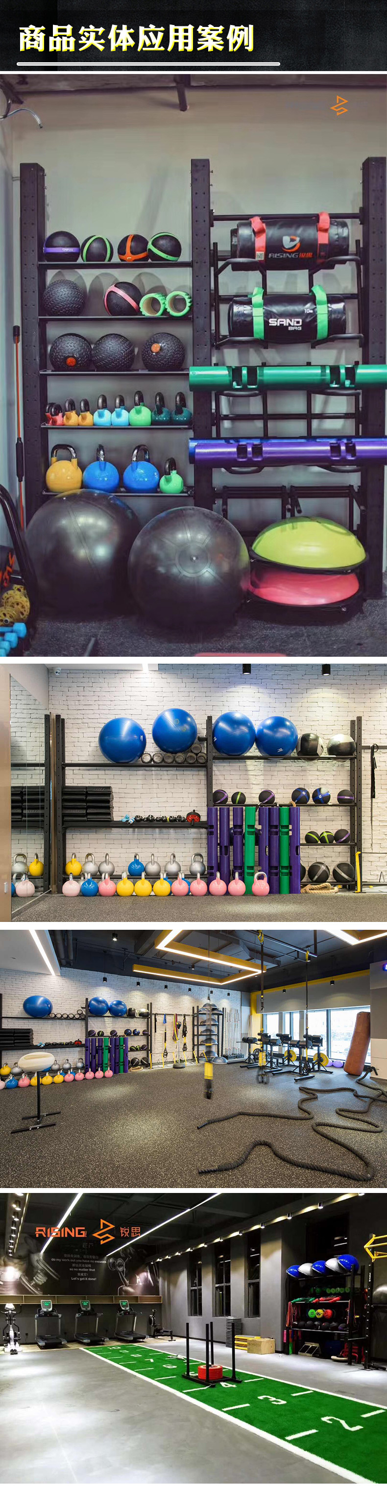 可放置哑铃,壶铃,铃片,墙球,药球,乳胶圈,跳绳,甩绳,奥杆,炮筒,瑜伽垫等